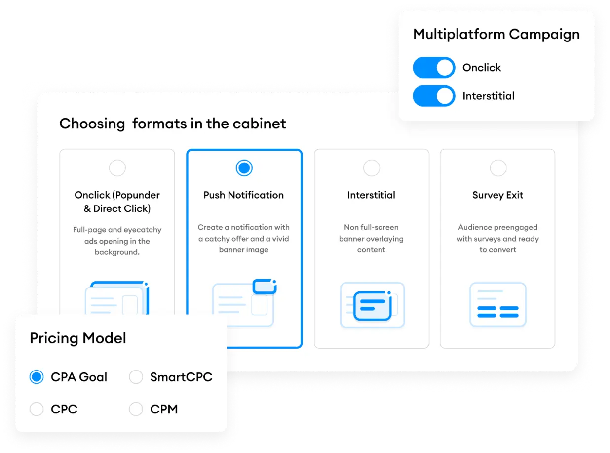 Pick among Popunder, Direct Click, Push, In-Page Push, Interstitial, and Survey Exit ad formats
